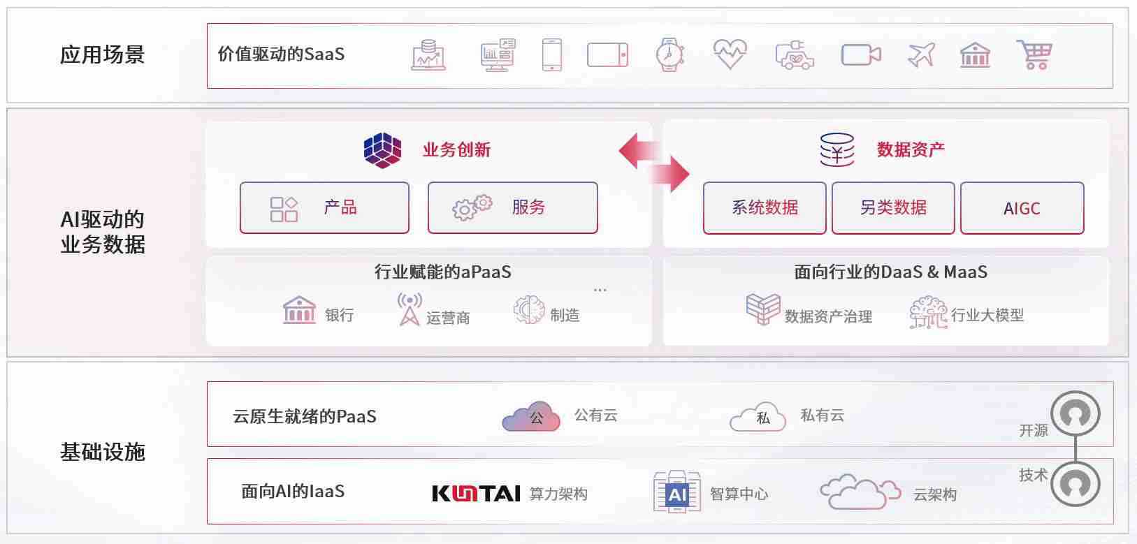 数字时代,,,,围绕企业数字化转型的关键要素,,,,z6com尊龙凯时数码开创性的提出数云融合战略和技术体系框架,,着力在云原生、、数字原生、、AI原生和信创产业上架构产品和服务能力,,,,为处在不同数字化转型阶段的快消零售、、、汽车、、金融、、医疗、、、政企、、、教育、、、、运营商等行业客户提供泛在的敏捷IT能力和融合的数据驱动能力,,,,构建跨界融合创新的数字业务场景和新业务模式,,,助力企业级客户建立面向未来的核心能力和竞争优势,,,,全面推动社会的数字化、、、智能化转型升级。。