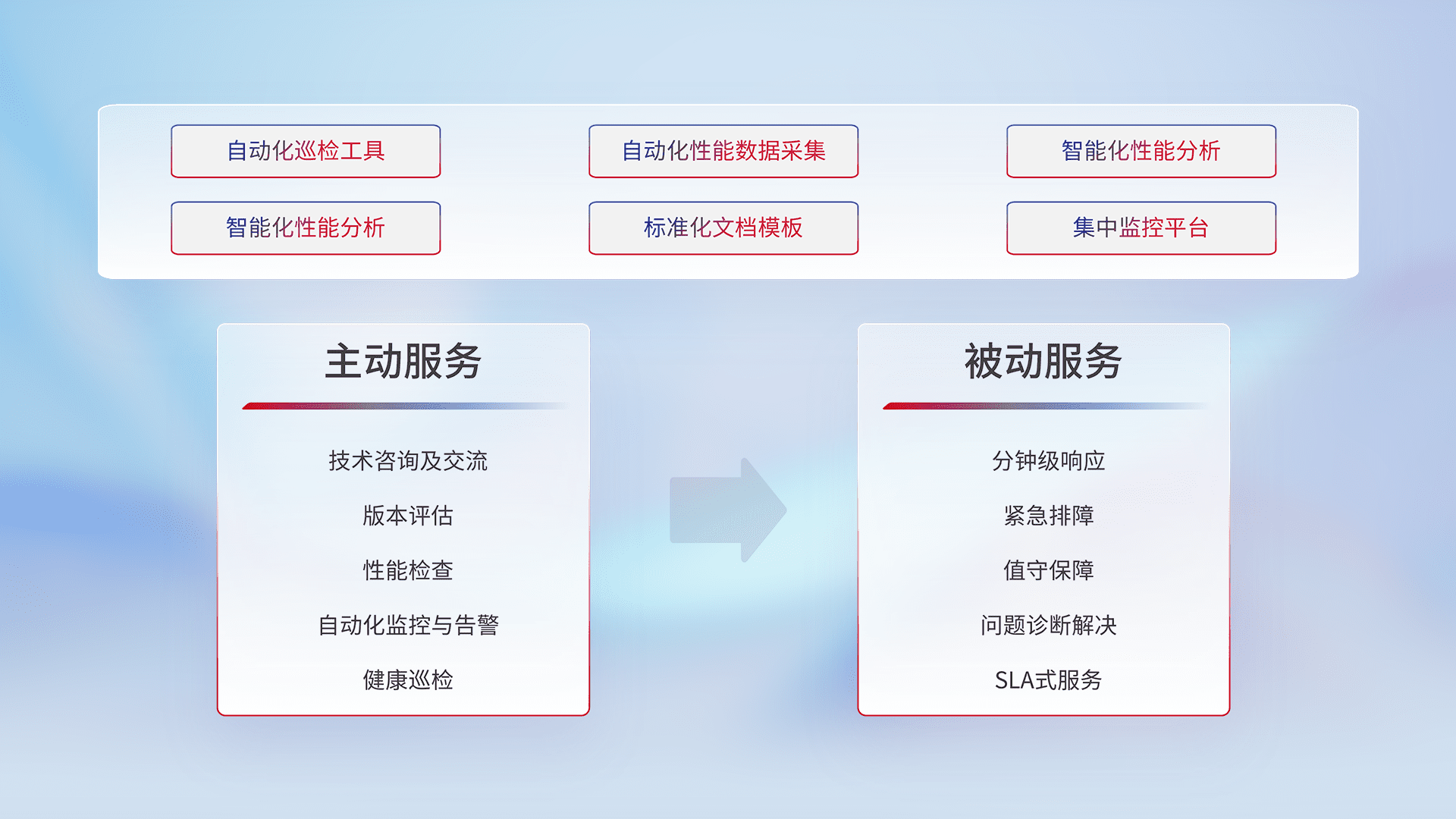 智能化工具和标准化文档,,保障服务质量,,提供主动服务(包含技术咨询、、版本评估、、性能检查、、自动化监控与告警、、、、健康巡检)和被动服务包含(分钟级响应、、、、紧急排障、、、值守保障、、、问题诊断解决、、、、SLA服务)。。。。